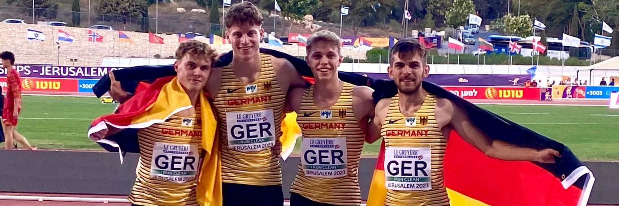 Am letzten Tag der U 20 Europameisterschaft 2023 in Jerusalem gab es eine weitere Medaille für einen sächsischen Athleten. Es wurde noch der Bronzerang, nur geschlagen von der Schweiz und den Niederländern. Nur um eine Hundertstel Sekunde vor Ivo Ziebold kamen die Niederländer ins Ziel. 40,15 s die deutsche Zeit, 40,14 s die Zeit für die Niederlande. Nur die Schweizer waren die Einzigen, die unter der 40 s-Marke (39,87 s) blieben. Unsere Staffelläufer freuten sich aber besonders, dass es eine Medaille geworden ist, gab es doch Wechselprobleme und Ivo Ziebold konstatierte: „Wir sind froh, dass wir das noch retten konnten“ Die deutschen liefen in der Besetzung Milian Zirbus (LG Osterode), Heiko Gussmann (LCS Heel Baden-Baden), Vincent Herbst (SC Potsdam und Ivo Zieblod, der von Claudia Marx trainiert wird. Glückwünsche an unsere deutschen Bronzemedaillengewinner mit ihrem souveränen Schlussläufer Ivo Ziebold und seiner Trainerin Claudia Marx.
