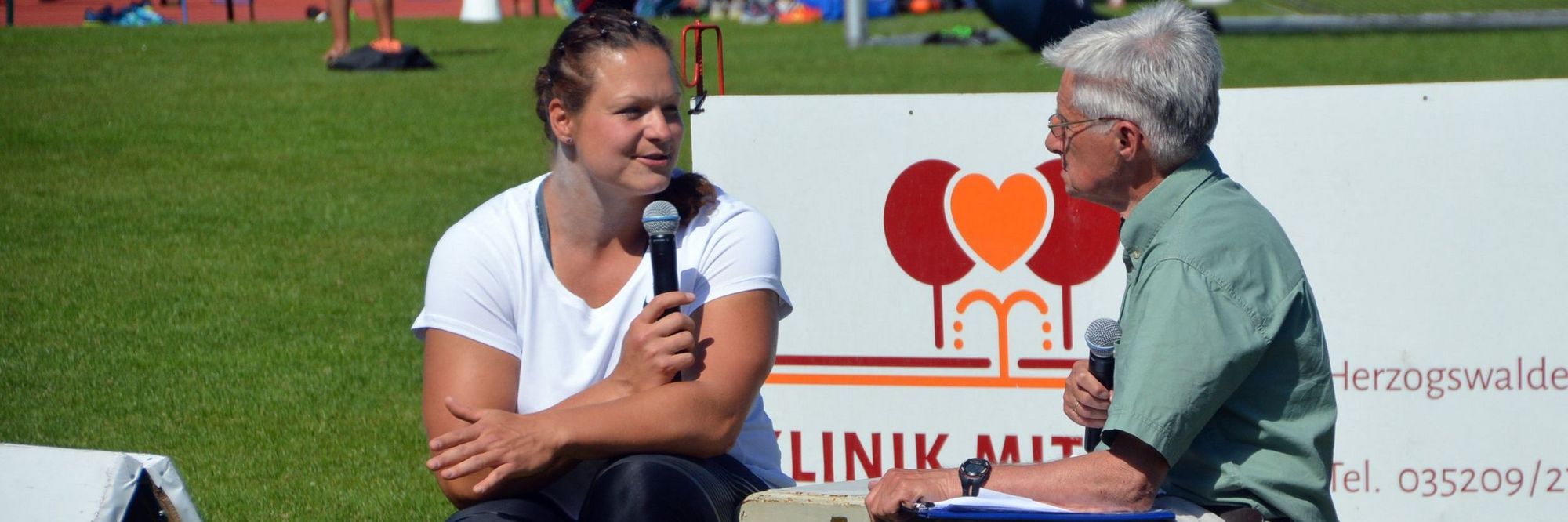 Archivfoto A. Bauer: Gunter Fischer im Interwiev mit Christina Schwanitz beim Erzgebirgsmeeting-